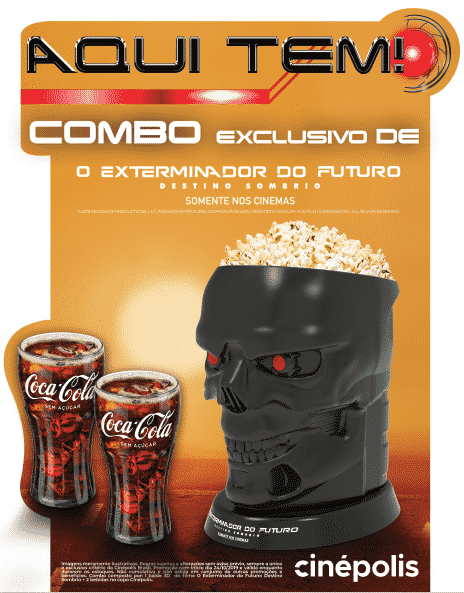A rede Cinépolis, maior operadora de cinemas da América Latina e segunda maior do mundo em ingressos vendidos, inicia no dia 24 de outubro a venda do combo de “O Exterminador do Futuro – Destino Sombrio”, composto por um balde 3D do REV-9 com pipoca e 2 bebidas. A pré-venda de ingressos já está disponível por meio do site: https://www.cinepolis.com.br/pre-vendas/